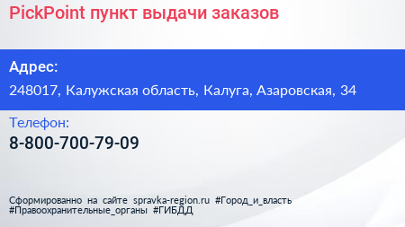 PickPoint, пункт выдачи заказов по адресу 248017, Калужская область, Калуга, Азаровская, 34 в дальнейшем Организация, размещена в следующих категориях: