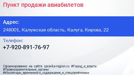 Пункт продажи авиабилетов по адресу 248001, Калужская область, Калуга, Кирова, 22 в дальнейшем Организация, размещена в следующих категориях: