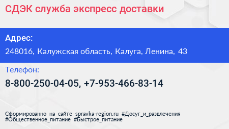 СДЭК, служба экспресс-доставки по адресу 248016, Калужская область, Калуга, Ленина, 43 в дальнейшем Организация, размещена в следующих категориях: