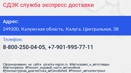 СДЭК, служба экспресс-доставки по адресу 249200, Калужская область, Калуга, Центральная, 38 в дальнейшем Организация, размещена в следующих категориях: