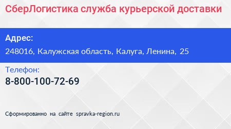 СберЛогистика, служба курьерской доставки по адресу 248016, Калужская область, Калуга, Ленина, 25 в дальнейшем Организация, размещена в следующих категориях: