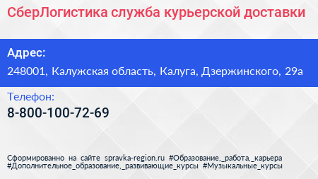 СберЛогистика, служба курьерской доставки по адресу 248001, Калужская область, Калуга, Дзержинского, 29а в дальнейшем Организация, размещена в следующих категориях: