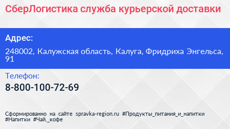 СберЛогистика, служба курьерской доставки по адресу 248002, Калужская область, Калуга, Фридриха Энгельса, 91 в дальнейшем Организация, размещена в следующих категориях:
