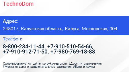 TechnoDom по адресу 248017, Калужская область, Калуга, Московская, 304 в дальнейшем Организация, размещена в следующих категориях: