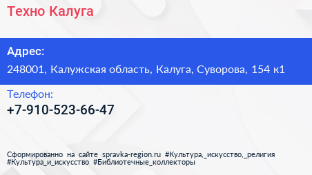 Техно Калуга по адресу 248001, Калужская область, Калуга, Суворова, 154 к1 в дальнейшем Организация, размещена в следующих категориях: