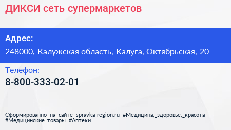 ДИКСИ, сеть супермаркетов по адресу 248000, Калужская область, Калуга, Октябрьская, 20 в дальнейшем Организация, размещена в следующих категориях: