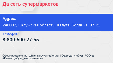 Да!, сеть супермаркетов по адресу 248002, Калужская область, Калуга, Болдина, 87 к1 в дальнейшем Организация, размещена в следующих категориях: