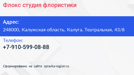 Флокс, студия флористики по адресу 248000, Калужская область, Калуга, Театральная, 43/8 в дальнейшем Организация, размещена в следующих категориях: