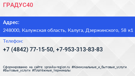 ГРАДУС40 по адресу 248000, Калужская область, Калуга, Дзержинского, 58 к1 в дальнейшем Организация, размещена в следующих категориях: