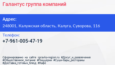 Галантус, группа компаний по адресу 248001, Калужская область, Калуга, Суворова, 116 в дальнейшем Организация, размещена в следующих категориях: