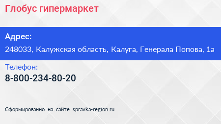 Глобус, гипермаркет по адресу 248033, Калужская область, Калуга, Генерала Попова, 1а в дальнейшем Организация, размещена в следующих категориях:
