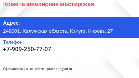 Комета, ювелирная мастерская по адресу 248001, Калужская область, Калуга, Кирова, 27 в дальнейшем Организация, размещена в следующих категориях:
