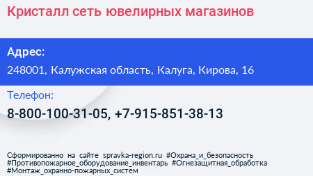 Кристалл, сеть ювелирных магазинов по адресу 248001, Калужская область, Калуга, Кирова, 16 в дальнейшем Организация, размещена в следующих категориях: