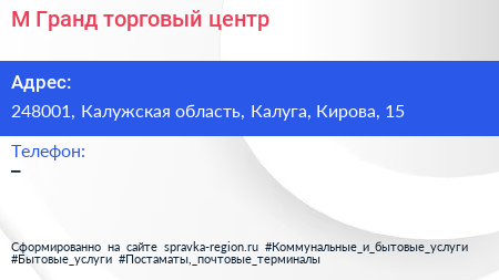 М-Гранд, торговый центр по адресу 248001, Калужская область, Калуга, Кирова, 15 в дальнейшем Организация, размещена в следующих категориях:
