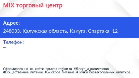 MIX, торговый центр по адресу 248033, Калужская область, Калуга, Спартака, 12 в дальнейшем Организация, размещена в следующих категориях: