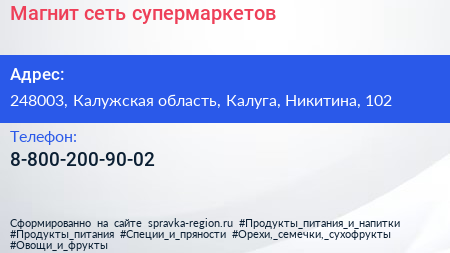 Магнит, сеть супермаркетов по адресу 248003, Калужская область, Калуга, Никитина, 102 в дальнейшем Организация, размещена в следующих категориях:
