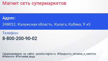 Магнит, сеть супермаркетов по адресу 248012, Калужская область, Калуга, Кубяка, 9 к5 в дальнейшем Организация, размещена в следующих категориях: