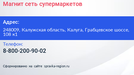 Магнит, сеть супермаркетов по адресу 248009, Калужская область, Калуга, Грабцевское шоссе, 108 к1 в дальнейшем Организация, размещена в следующих категориях: