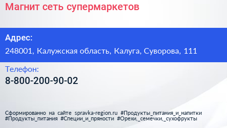 Магнит, сеть супермаркетов по адресу 248001, Калужская область, Калуга, Суворова, 111 в дальнейшем Организация, размещена в следующих категориях: