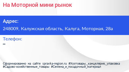 На Моторной, мини-рынок по адресу 248009, Калужская область, Калуга, Моторная, 28а в дальнейшем Организация, размещена в следующих категориях: