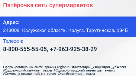 Пятёрочка, сеть супермаркетов по адресу 248008, Калужская область, Калуга, Тарутинская, 184Б в дальнейшем Организация, размещена в следующих категориях: