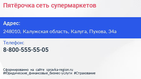 Пятёрочка, сеть супермаркетов по адресу 248010, Калужская область, Калуга, Пухова, 34а в дальнейшем Организация, размещена в следующих категориях: