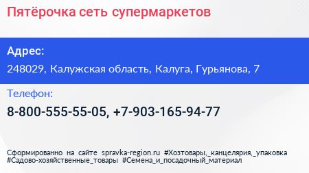 Пятёрочка, сеть супермаркетов по адресу 248029, Калужская область, Калуга, Гурьянова, 7 в дальнейшем Организация, размещена в следующих категориях: