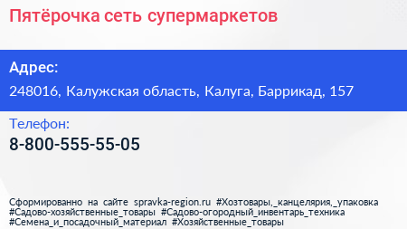 Пятёрочка, сеть супермаркетов по адресу 248016, Калужская область, Калуга, Баррикад, 157 в дальнейшем Организация, размещена в следующих категориях: