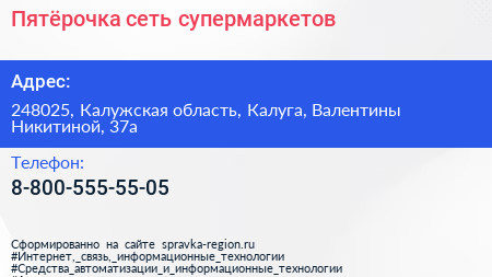 Пятёрочка, сеть супермаркетов по адресу 248025, Калужская область, Калуга, Валентины Никитиной, 37а в дальнейшем Организация, размещена в следующих категориях: