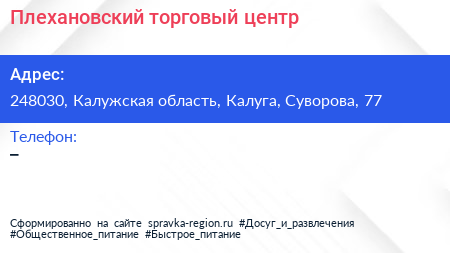 Плехановский, торговый центр по адресу 248030, Калужская область, Калуга, Суворова, 77 в дальнейшем Организация, размещена в следующих категориях:
