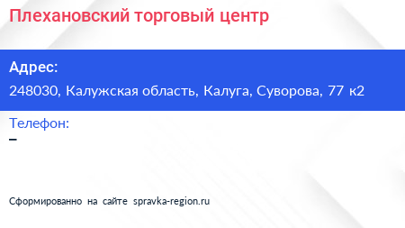Плехановский, торговый центр по адресу 248030, Калужская область, Калуга, Суворова, 77 к2 в дальнейшем Организация, размещена в следующих категориях: