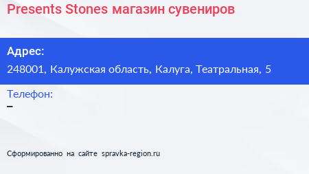 Presents & Stones, магазин сувениров по адресу 248001, Калужская область, Калуга, Театральная, 5 в дальнейшем Организация, размещена в следующих категориях: