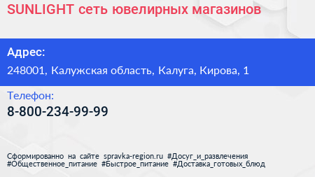 SUNLIGHT, сеть ювелирных магазинов по адресу 248001, Калужская область, Калуга, Кирова, 1 в дальнейшем Организация, размещена в следующих категориях:
