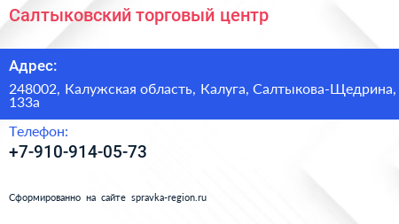 Салтыковский, торговый центр по адресу 248002, Калужская область, Калуга, Салтыкова-Щедрина, 133а в дальнейшем Организация, размещена в следующих категориях: