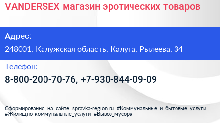 VANDERSEX, магазин эротических товаров по адресу 248001, Калужская область, Калуга, Рылеева, 34 в дальнейшем Организация, размещена в следующих категориях: