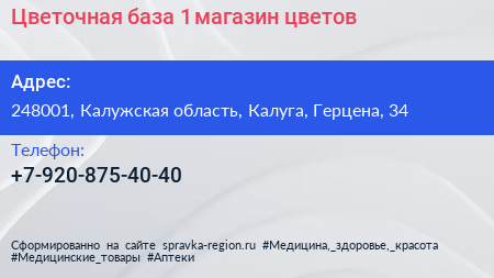 Цветочная база №1, магазин цветов по адресу 248001, Калужская область, Калуга, Герцена, 34 в дальнейшем Организация, размещена в следующих категориях: