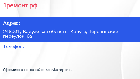 1ремонт.рф по адресу 248001, Калужская область, Калуга, Теренинский переулок, 6а в дальнейшем Организация, размещена в следующих категориях: