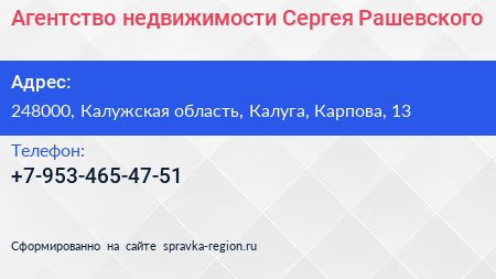 Агентство недвижимости Сергея Рашевского по адресу 248000, Калужская область, Калуга, Карпова, 13 в дальнейшем Организация, размещена в следующих категориях: