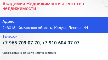 Академия Недвижимости, агентство недвижимости по адресу 248016, Калужская область, Калуга, Ленина, 44 в дальнейшем Организация, размещена в следующих категориях: