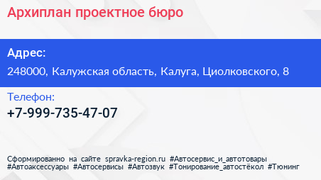 Архиплан, проектное бюро по адресу 248000, Калужская область, Калуга, Циолковского, 8 в дальнейшем Организация, размещена в следующих категориях: