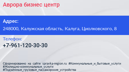 Аврора, бизнес-центр по адресу 248000, Калужская область, Калуга, Циолковского, 8 в дальнейшем Организация, размещена в следующих категориях: