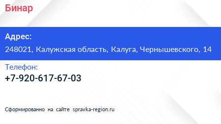 Бинар по адресу 248021, Калужская область, Калуга, Чернышевского, 14 в дальнейшем Организация, размещена в следующих категориях: