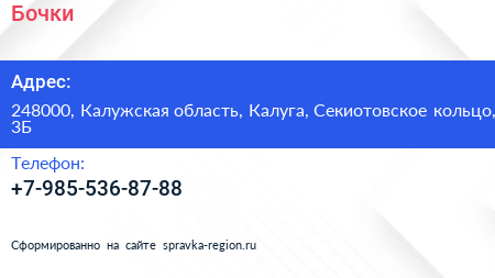 Бочки по адресу 248000, Калужская область, Калуга, Секиотовское кольцо, 3Б в дальнейшем Организация, размещена в следующих категориях: