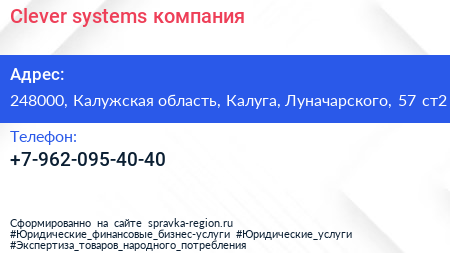 Clever systems, компания по адресу 248000, Калужская область, Калуга, Луначарского, 57 ст2 в дальнейшем Организация, размещена в следующих категориях: