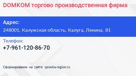 DOMKOM, торгово-производственная фирма по адресу 248001, Калужская область, Калуга, Ленина, 81 в дальнейшем Организация, размещена в следующих категориях:
