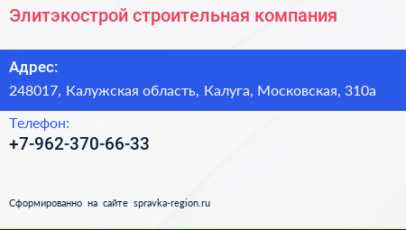 Элитэкострой, строительная компания по адресу 248017, Калужская область, Калуга, Московская, 310а в дальнейшем Организация, размещена в следующих категориях: