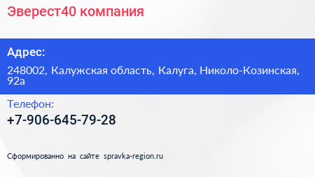Эверест40, компания по адресу 248002, Калужская область, Калуга, Николо-Козинская, 92а в дальнейшем Организация, размещена в следующих категориях: