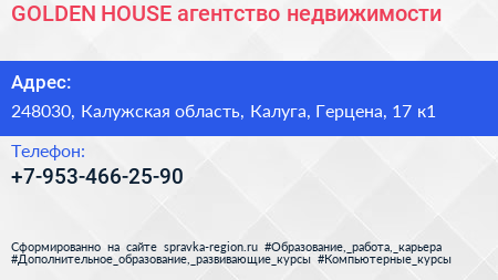 GOLDEN HOUSE, агентство недвижимости по адресу 248030, Калужская область, Калуга, Герцена, 17 к1 в дальнейшем Организация, размещена в следующих категориях: