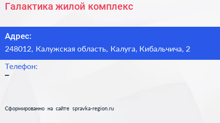Галактика, жилой комплекс по адресу 248012, Калужская область, Калуга, Кибальчича, 2 в дальнейшем Организация, размещена в следующих категориях: