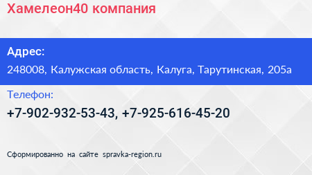 Хамелеон40, компания по адресу 248008, Калужская область, Калуга, Тарутинская, 205а в дальнейшем Организация, размещена в следующих категориях: